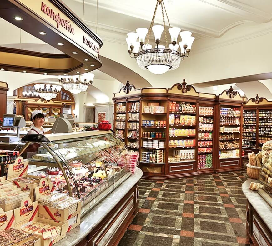 Есть здесь и уютный гастроном, восхитительный магазин в стиле 1950-х годов, где продаются изысканные продукты питания, вино, шоколад и классические советские лакомства — конфеты, морепродукты и икра.