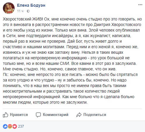 «Ох, мне, конечно, очень стыдно про это говорить, но это я виновата в распространении новости про Дмитрия Хворостовского и его якобы уход из жизни. Только моя вина», — написала она в Facebook.