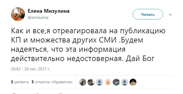 Ранее о смерти певца у себя в Twitter написала сенатор Елена Мизулина. Затем она удалила твит, отметив, что просто отреагировала на публикации в «Комсомольской правде» и других СМИ.