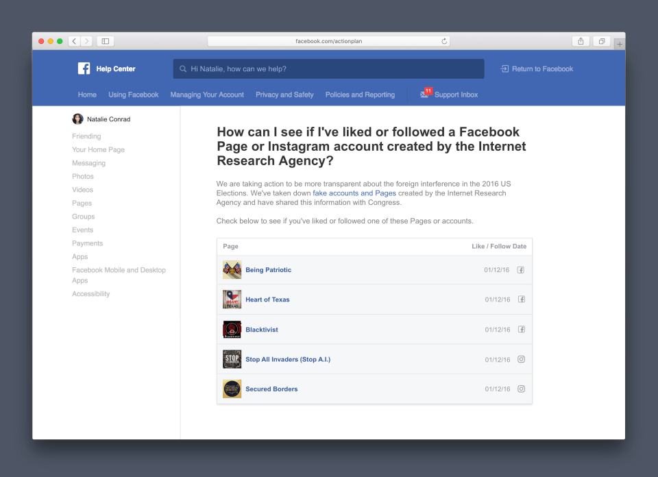 «В рамках этой продолжающейся приверженности мы скоро создадим портал, позволяющий людям на Facebook узнавать, какие «Агентства по изучению интернета» в Facebook или Instagram они лайкали или за какими следили в период с января 2015 года по август 2017 года. Этот инструмент будет доступен для использования к концу года в Справочном центре Facebook.