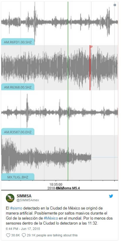 «Землетрясение, зафиксированное в Мехико, имело искусственную природу. Возможно, причиной стали массовые прыжки во время гола сборной Мексики на ЧМ. Как минимум два городских датчика зафиксировали его в 11 часов 32 минуты», — говорится в сообщении SIMMSA.