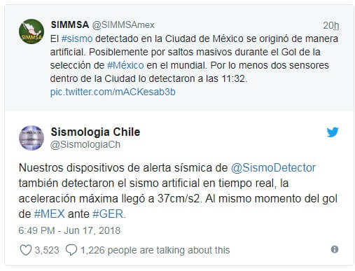 Сейсмологи в Мексике зафиксировали небольшое землетрясение, которое, по их данным, могло быть вызвано прыжками болельщиков во время матча сборной страны против команды Германии на чемпионате мира по футболу. Об этом сообщает телеканал «Дождь«, со ссылкой на региональную сеть мониторинга землетрясений SIMMSA.
