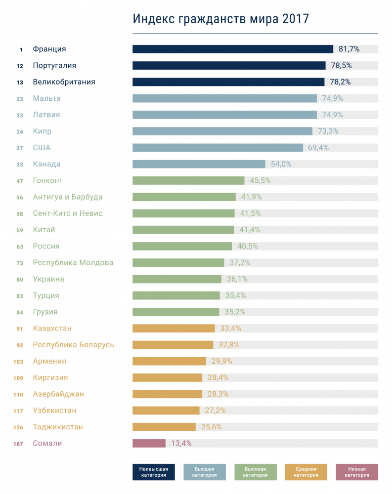 Эксперты ранжировали 209 гражданств по разным показателям за период с 2013 по 2017 год. Первое место в рейтинге, впервые за пять лет, заняла Франция (81,7%), Германия – второе место (81,6%). Страны в первой десятке Индекса практически не изменились: Исландия, Дания, Нидерланды, Норвегия, Швеция, Финляндия, Италия, Ирландия, Швейцария, Австрия. Единственное изменение – Ирландия заменила в десятке лидеров Испанию, которая переместилась на 11-е место. Замыкают список Афганистан (14,6%) и Сомали (13,4%).
