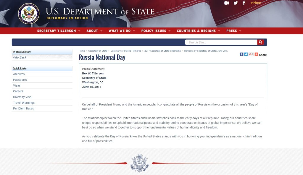 В четверг Госдепартамент опубликовал заявление госсекретаря Рекса Тиллерсона, в котором тот от имени президента Дональда Трампа и всего американского народа поздравил «всех жителей России с Днем России».