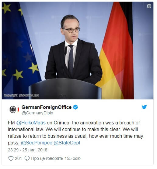 В то же время министр иностранных дел Германии Гайко Маас заявил, что «аннексия Крыма противоречит международному праву».