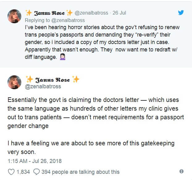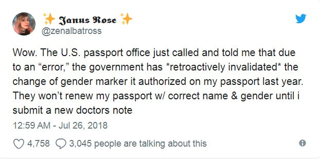 25 июля Роуз отметила в Твиттере, что Управление паспортного контроля отказалась продлевать ее паспорт с правильным именем и полом, пока она не отправит новую запись врача о смене пола.