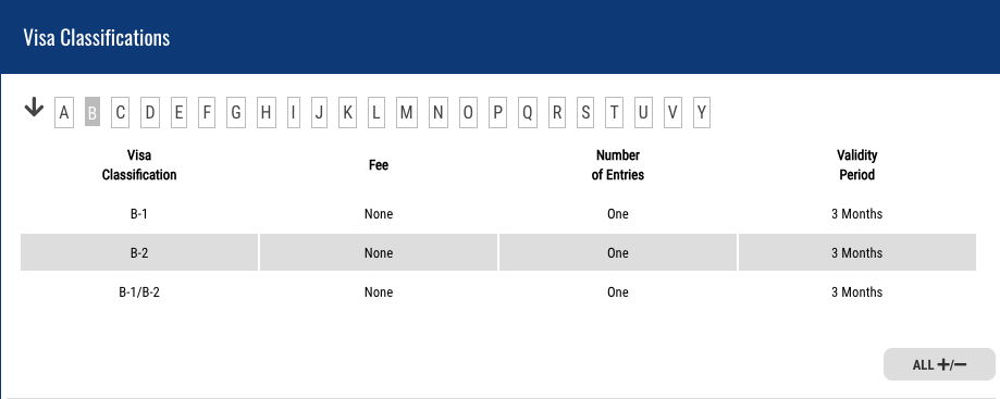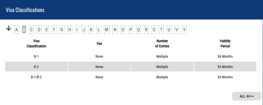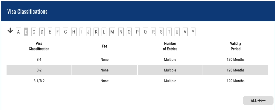- Visa Classifications (для неиммиграционных виз): здесь можно посмотреть доступные вам типы виз (неиммиграционных), сумму визового сбора (reciprocity fee), количество въездов и срок действия визы для граждан выбранной страны.
