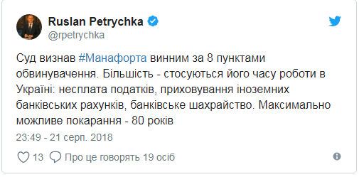 «Суд признал Манафорта виновным по 8 пунктам обвинения. Большинство — касаются его времени работы в Украине: неуплата налогов, сокрытие иностранных банковских счетов, банковское мошенничество. Максимально возможное наказание — 80 лет», — цитирует журналиста Обозреватель.