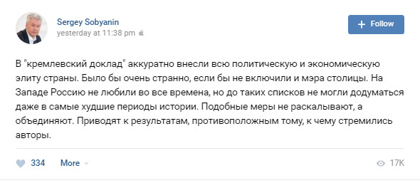 «В «кремлевский доклад» аккуратно внесли всю политическую и экономическую элиту страны. Было бы очень странно, если бы не включили и мэра столицы. На Западе Россию не любили во все времена, но до таких списков не могли додуматься даже в самые худшие периоды истории. Подобные меры не раскалывают, а объединяют. Приводят к результатам, противоположным тому, к чему стремились автор», — написал Собянин в Вконтакте.
