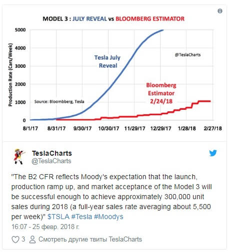 Днем 3 апреля Tesla опубликовала квартальный отчет. За последнюю неделю компания выпустила 2020 автомобилей Model 3. В компании заявили, что количество предзаказов на машину «оставалось стабильным в первом квартале». Tesla надеется выйти на 5000 машин в неделю летом 2018 года.