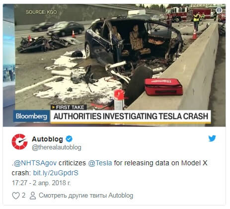 Инвесторы до последнего верили в то, что компания решит проблемы, но в марте акции рухнули. Поводом стала автокатастрофа с участием Model X в Калифорнии — 23 марта машина в режиме автопилота на полной скорости врезалась в отбойник посреди дороги, водитель погиб. Tesla уже заявила, что, судя по данным с накопителей автомобиля, система несколько раз предупредила водителя, что он должен держать руль и контролировать обстановку. Почему автопилот «решил» свернуть в сторону отбойника, неизвестно. Вскоре после этого Tesla отозвала почти половину произведенных машин (другой модели — Model S) для замены детали гидроусилителя руля. За неделю компания подешевела на 17% и теперь вновь оценивается дешевле, чем Ford.