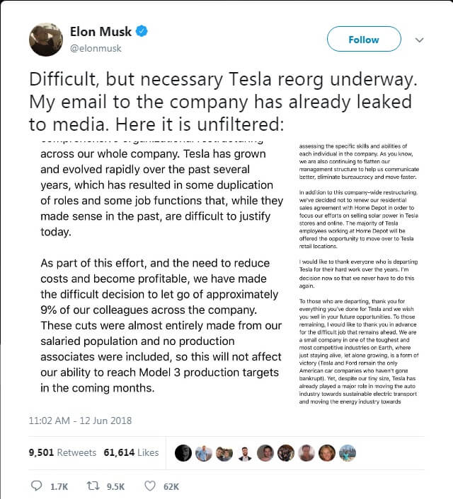 Чтобы сократить расходы и стать прибыльной компанией, мы приняли непростое решение расстаться с 9% нашего персонала. Эти сокращения в основном касаются наёмных сотрудников, и наши партнёры по производству не включены в этот список. Ситуация не повлияет на достижение целей по производству автомобиля Model 3.