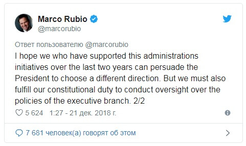 А сенатор-демократ Крис Мёрфи сказал, что читал письмо главы Пентагона с отвисшей челюстью. По его мнению, Мэттис ушел из-за того, что президент оскорблял союзников США и и был слишком мягок с Россией и Китаем.