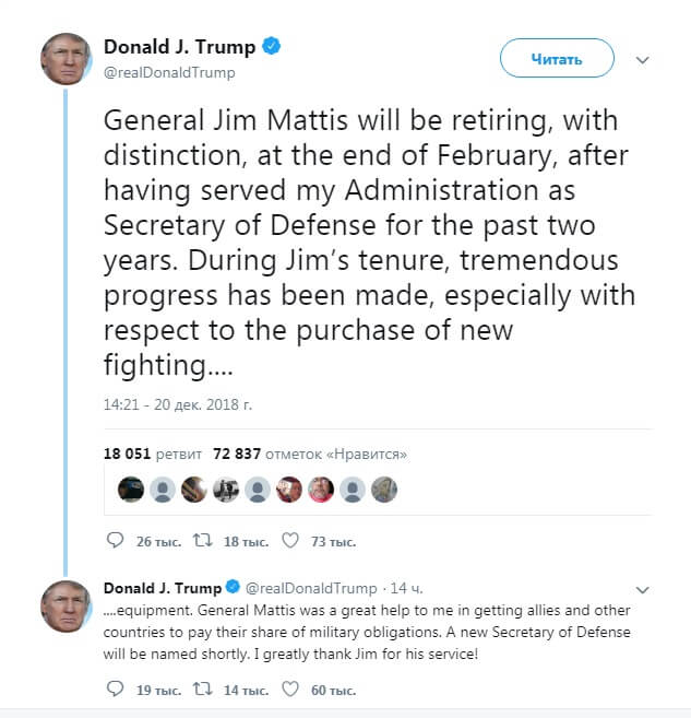 «Генерал Джим Мэттис уйдет с почетом на покой в конце февраля, прослужив в моей администрации министром обороны последние два года, — написал президент. — За время пребывания Джима в должности мы достигли огромного прогресса, особенно в вопросах снабжения новой боевой техникой».