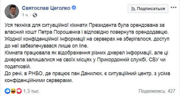 Бывший пресс-секретарь президента Украины Святослав Цеголко заявил, что техника из ситуационной комнаты была арендована на средства Петра Порошенко, поэтому ее вернули владельцу. По его словам, секретной информации там не было.