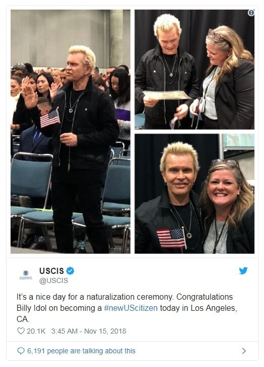 «Это прекрасный день церемонии натурализации», написано на странице USCIS в твиттере. «Поздравляем Билли Айдола с тем, что он стал #newUScitizen сегодня в Лос-Анджелесе, штат Калифорния».