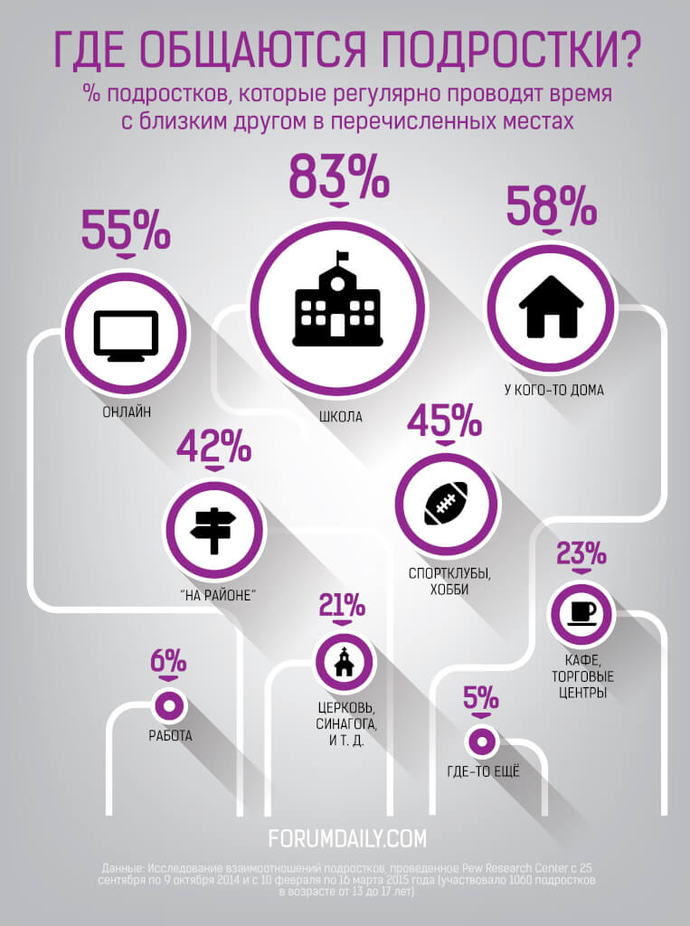 Дети все же пока общаются не только через экраны компьютеров и смартфонов – аж 83% подростков проводят время с лучшим другом в школе, 58% у кого-то дома и 55% онлайн.