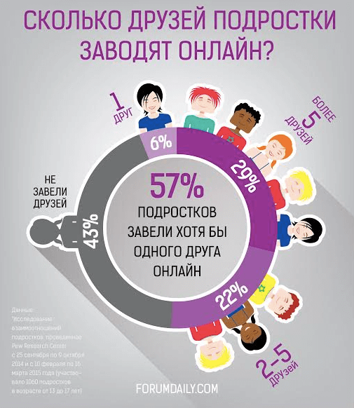 Более половины подростков завели себе как минимум одного друга онлайн, а почти треть – встретили там более пяти друзей.