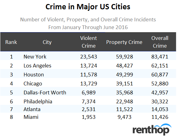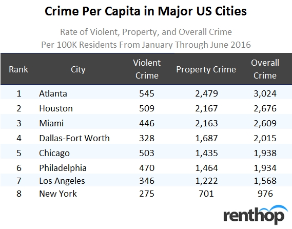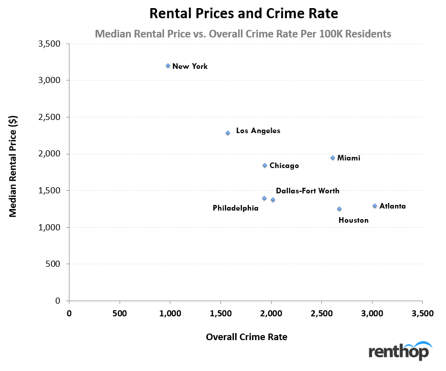 В Нью-Йорке самые высокие цены и наименьшее количество преступлений, в то время как аренда жилья в таких городах, как Атланта и Хьюстон, намного дешевле, но там больше преступлений.