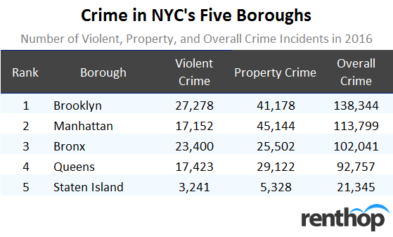В Бруклине наибольшее количество преступлений приходится на более чем 130 000 инцидентов, зарегистрированных в 2016 году, в то время как на острове Стейтен меньше всего — 20 000 инцидентов. Манхэттен также имеет наибольшее количество имущественных преступлений, в то время как Бруклин имеет наибольшее количество насильственных преступлений.