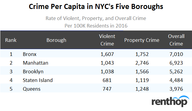 При учете населения Бронкс имеет самый высокий общий уровень и уровень насильственных преступлений. Манхэттен обладает самым высоким уровнем преступности в сфере собственности. Квинс и Стейтен-Айленд — самые безопасные районы с менее чем 1000 насильственными преступлениями на 100 000 жителей.