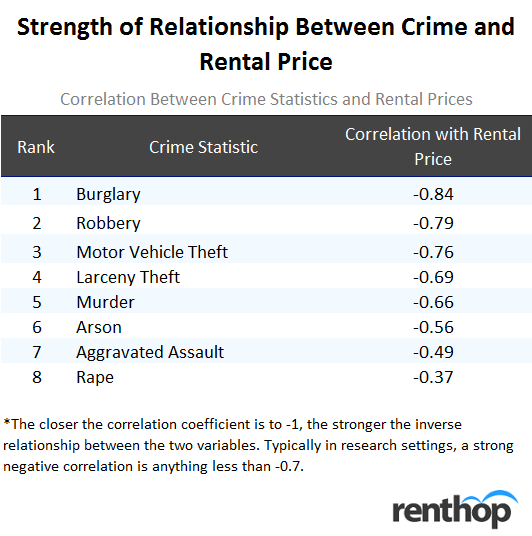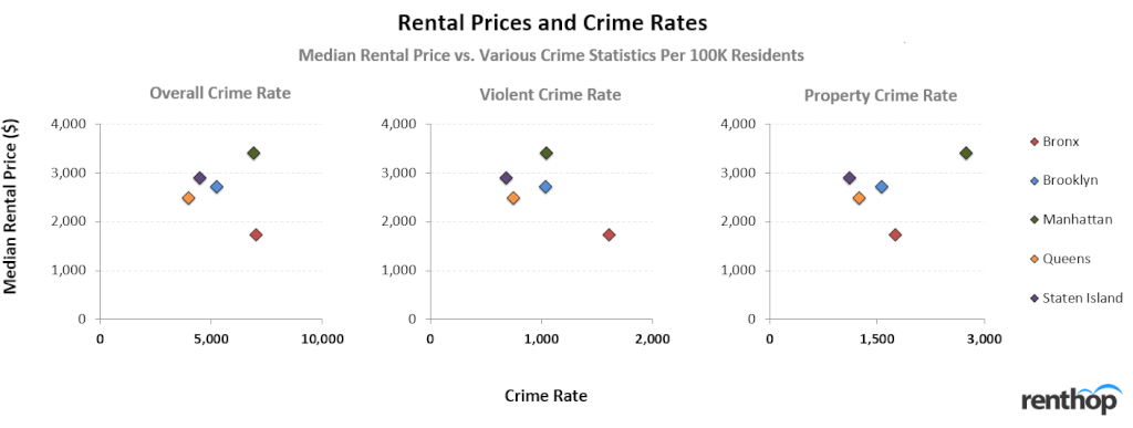 В Нью-Йорке, например, насильственные преступления наиболее негативно влияют на стоимость аренды, в то время как имущественные преступления (например, кража со взломом или кража автотранспортных средств) влияли в меньшей степени.