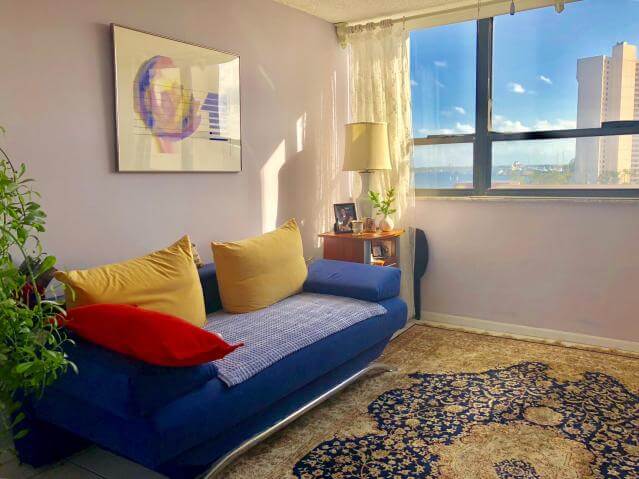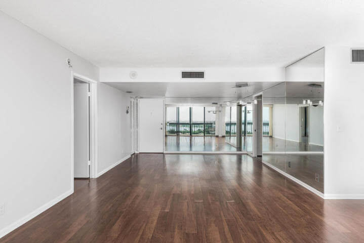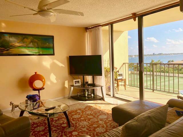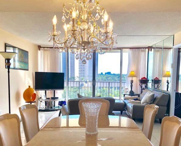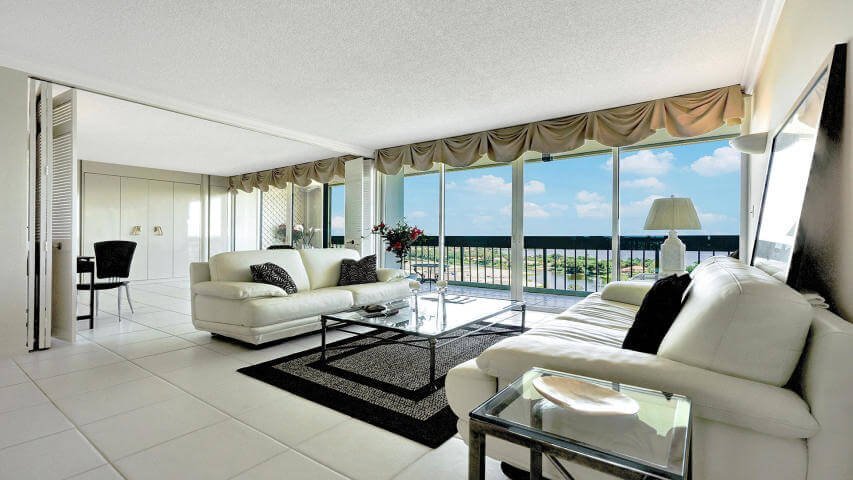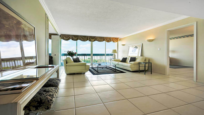 Этот кондоминиум расположен на 5 этаже 29-этажного дома прямо возле океана в Палм-Бич. В квартире площадью 1 170 квадратных футов (109 кв. м) — две спальни, два ванные комнаты и большая кухня.