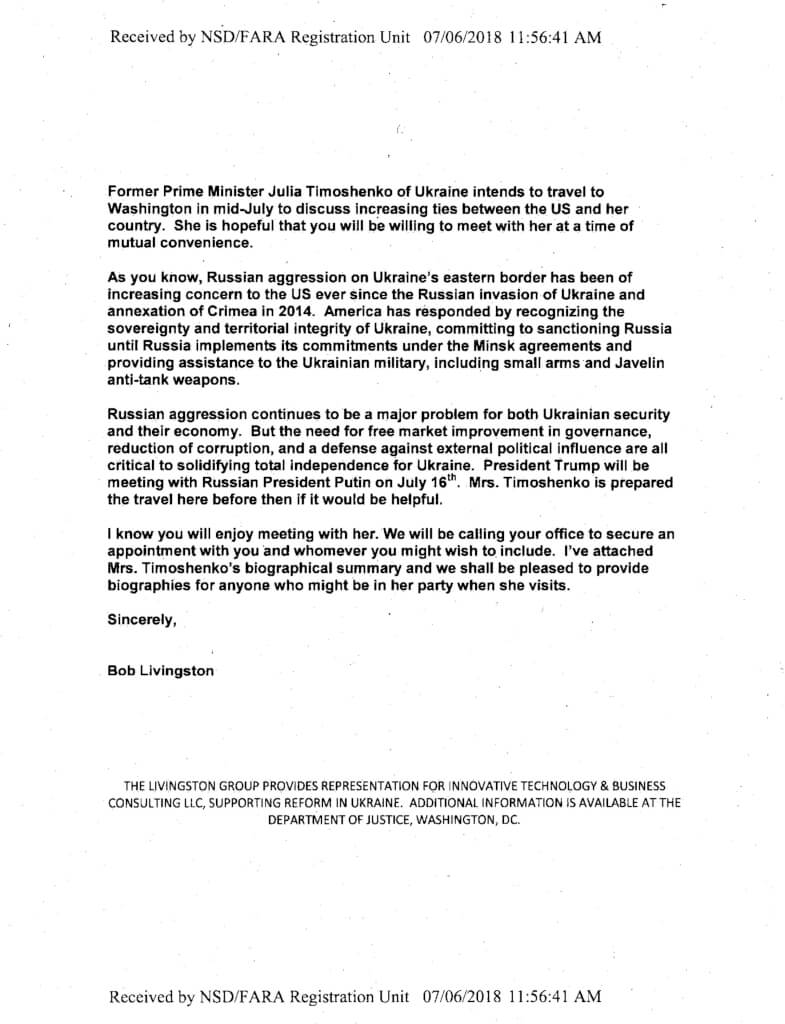 Документ подписан лоббистом Бобом Ливингстоном, представителем компании The Livingstone Group, который отмечает, что «бывший премьер-министр Украины Юлия Тимошенко намеревалась приехать в Вашингтон в середине июля для обсуждения расширения связей между США и ее страной».