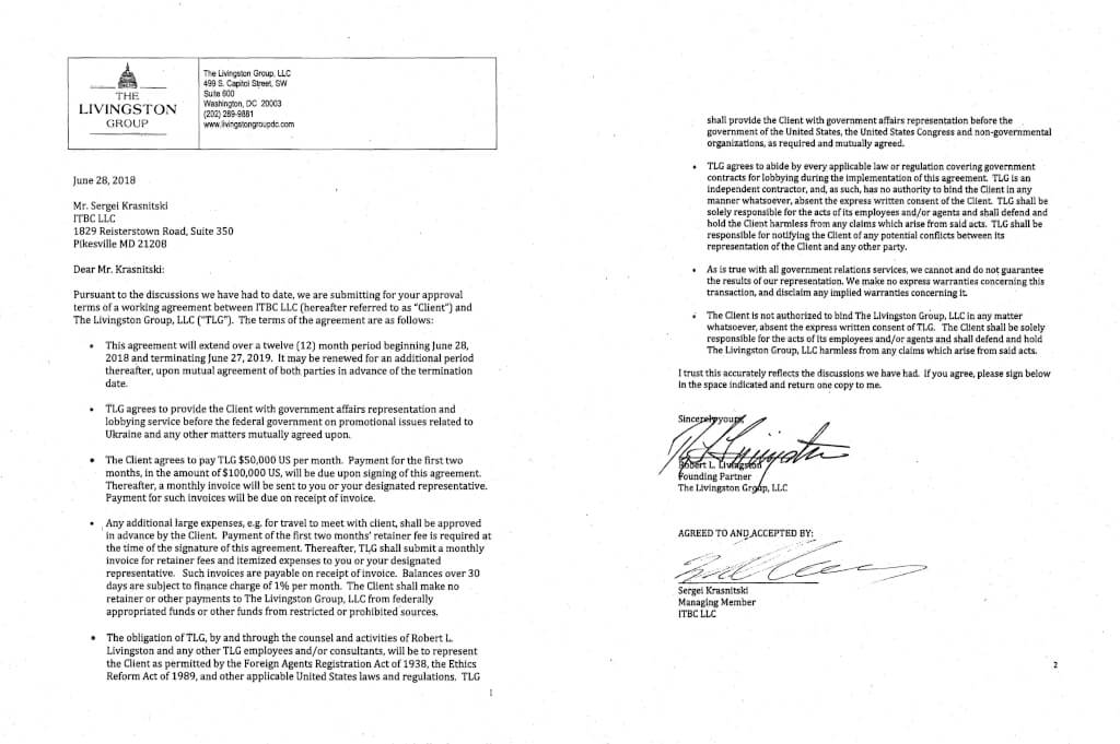 Контрагентом и заказчиком услуг The Livingstone Group является компания Innovative Technology & Business, документ от которой подписал Сергей Красницкий, управляющий менеджер. По условиям контракта, заключенного 28 июня 2018 года со сроком действия на год, клиент должен выплачивать лоббистской компании 50 тысяч долларов ежемесячно. Оплату 100 тысяч за первые два месяца, согласно условиям, заказчик внес во время подписания договора. По истечении срока контракт может быть продлен по взаимной договоренности сторон. В договоре также отмечено, что компания не гарантирует результатов своих представительских услуг.