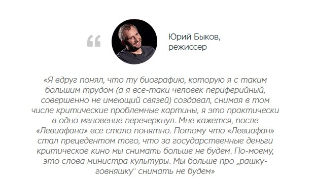 Дмитрий Нагиев, актер: «Позиция российского Министерства культуры и российского министра культуры, опять же как организации, которая дает деньги, да еще и пописывает сценарии, — каждый сценарий должен быть залитован в Минкульте. Ведь прямо оттуда спускаются некоторые сценарии».