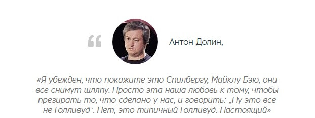 «Людей не обманешь, если они платят за это деньги», — утверждает Антон Долин. Патриотическую карту разыграли. Но так и Голливуд вовсю эксплуатирует любовь к звездно-полосатой родине. И если в фильме оскароносного Дэмьена Шазелла про высадку на Луне показывают Гагарина и первый советский выход в открытый космос, то картину разносят в пух и прах на топовых американских телеканалах. А самое интересное, на него не идут зрители, сборы малы.