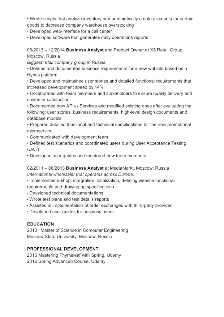 Лишний опыт. Работодатели не понимали, что в резюме разработчика делает мой прошлый опыт работы бизнес-аналитиком. Он не заинтересовал ни одного рекрутера, с которым мы общались. Его я отрезал в первую очередь.