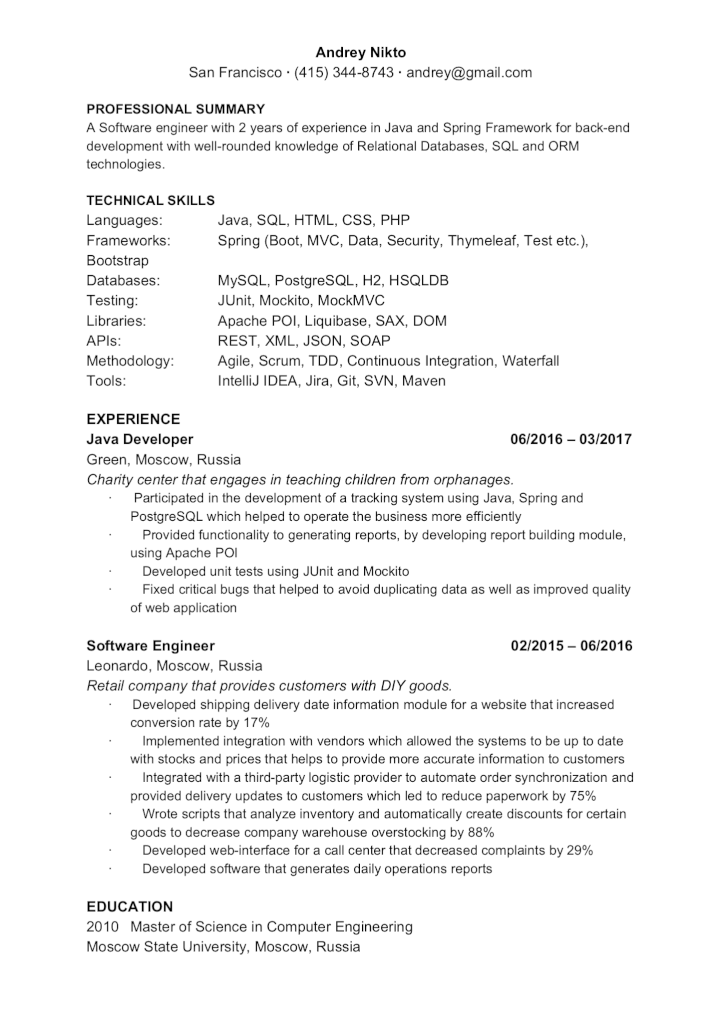 Отсутствие подробностей. В моем резюме опыт разработки был слишком общим. Например, я написал, что участвовал в волонтерском проекте: это мы делали сайт для благотворительной организации. В Америке же важны числа: сколько сайтов и для каких компаний. В резюме здесь лучше писать не «продавала холодильники», а «продала 100 холодильников». Доказательства числам в резюме не нужны, но если они будут сильно завышены, это поймут, когда будут проверять навыки на техническом интервью.