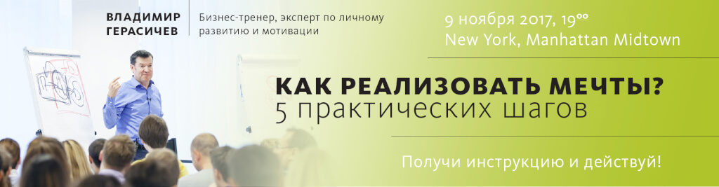 Известный в России и США бизнес-тренер Владимир Герасичев поделится с жителями Нью-Йорка проверенными на практике инструментами для достижения желаемого. 9 ноября в Нью-Йорке он проведет специальный мастер-класс “Как реализовать мечты? 5 практических шагов”.
