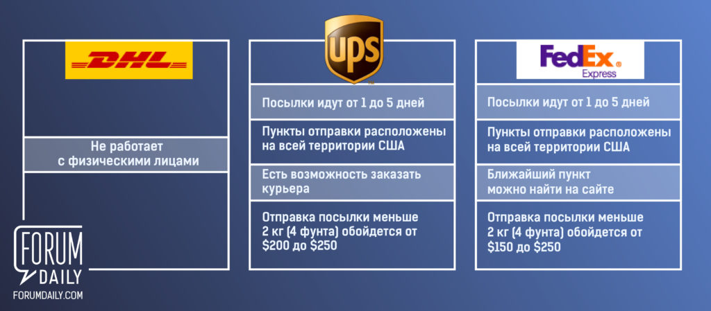 ForumDaily cравнил услуги основных служб, которые занимаются отправкой международных посылок из США, чтобы каждый мог сделать свой выбор.