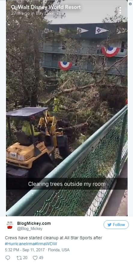 Как сообщает Entertainment Weekly, много гостей выкладывали фото различных курортных отелей Disney World. Работники с помощью строительной техники уже начали уборку упавших деревьев и мусора.
