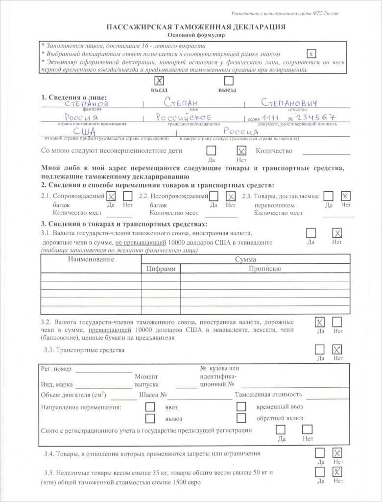 Вот пример правильно заполненной декларации на ввоз в Россию 11 000 долларов наличными: