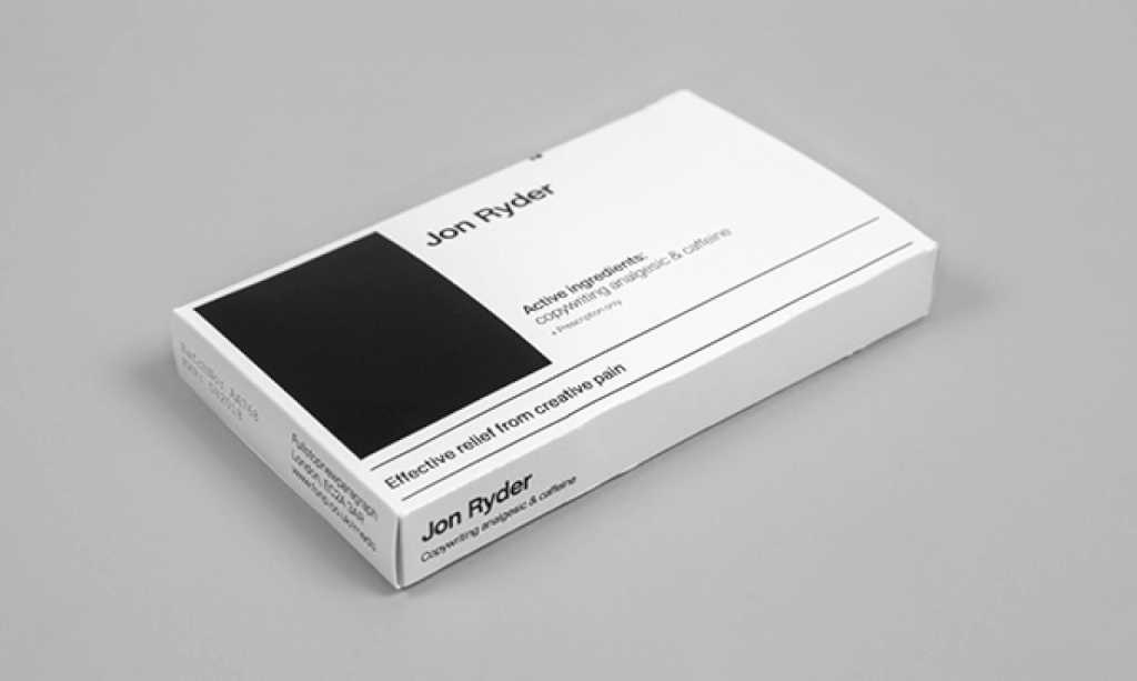 Копирайтер-фрилансер Джон Райдер разработал поддельное лекарство и отправил его по почте креативным агентствам. Внутри коробки находился «информационный листок» — альтернатива традиционному резюме. В нем указывалось, что лекарство может использоваться для «краткосрочного лечения острой творческой боли».