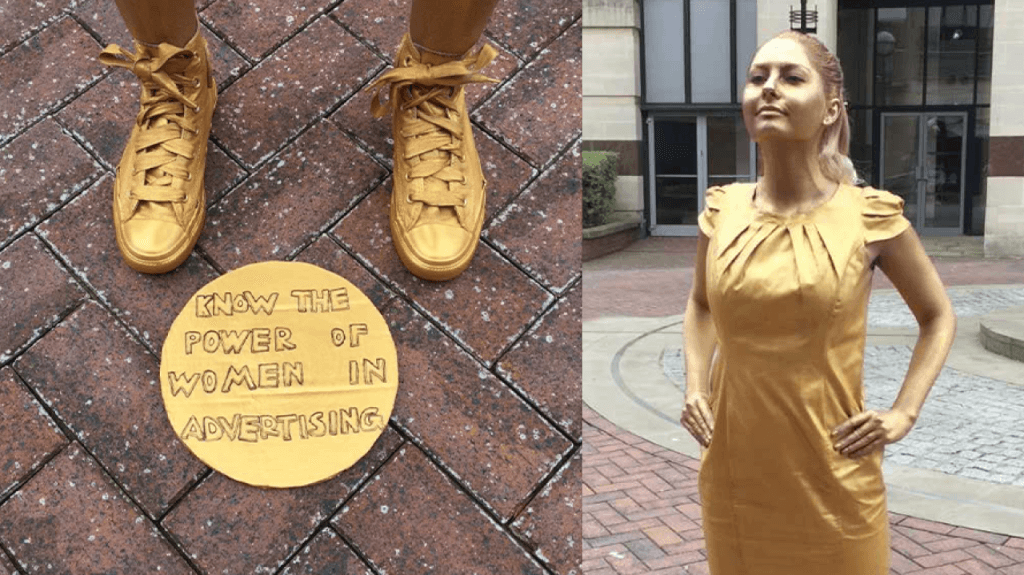 1. Ради работы в рекламном агентстве McCann Worldwide выпускница Джейд Деланей превратилась в копию статуи Бесстрашная девочка, установленной в Нью-Йорке в поддержку стремления женщин делать финансовую карьеру. Перед этим Джейд отправила письмо директору агентства, где рассказала о себе и своем намерении стоять перед входом в здание агентства, выкрасив себя золотой краской. Перфоманс сопровождался подписью «Знаю силу женщин в рекламе». Девушка простояла так два часа и получила заветное предложение об оплачиваемой стажировке.