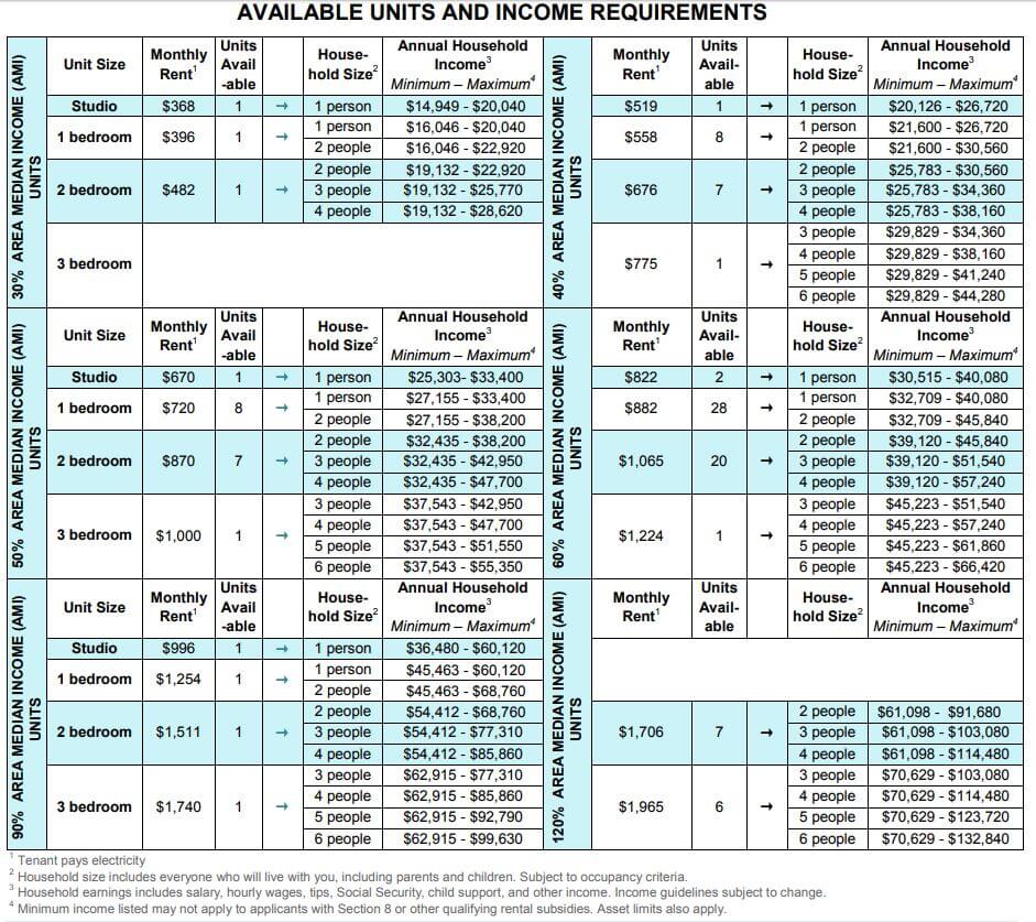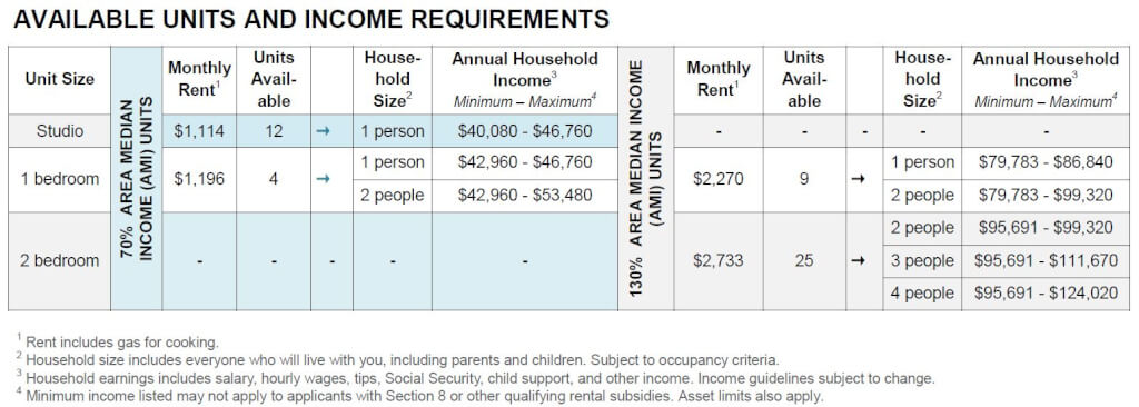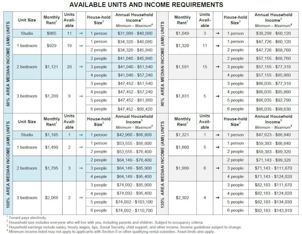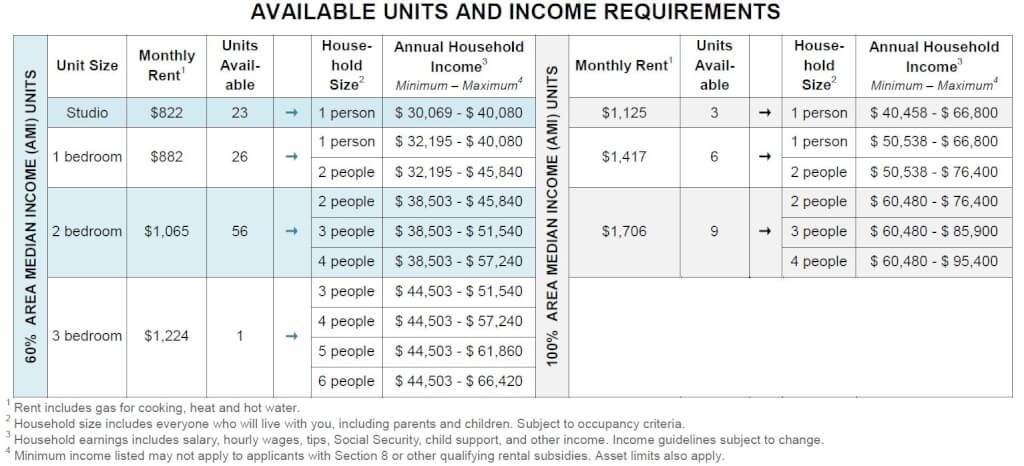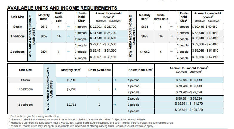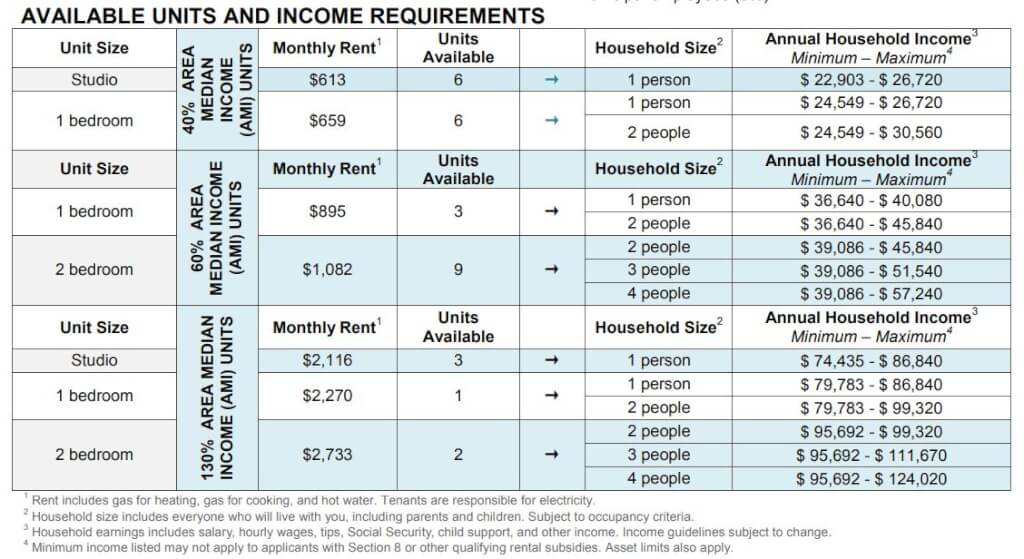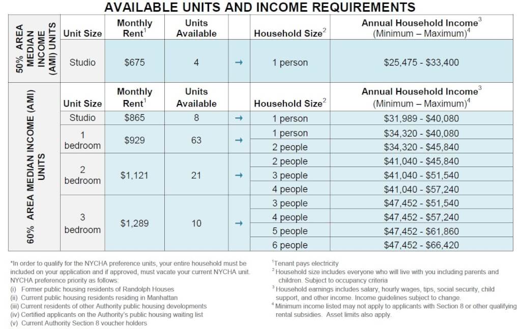 Для участия в лотерее претендент на студию должен зарабатывать от $30 445 до $40 080 в год. Те, кто хочет снимать однокомнатную квартиру за $659 в месяц, должны иметь годовой доход $24 549 — $26 720 (один человек) и $24 549 — $30 560, если в семье два человека. Трехкомнатная квартира за $801 в месяц доступна на следующих условиях: семья из двух человек должна иметь годовой доход в диапазоне $29 451 — $30 560, семья из трех человек — $29 451 — $34 360, семья из четырех человек — $29 451 — $38 160.