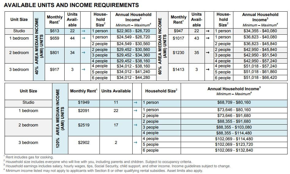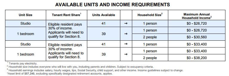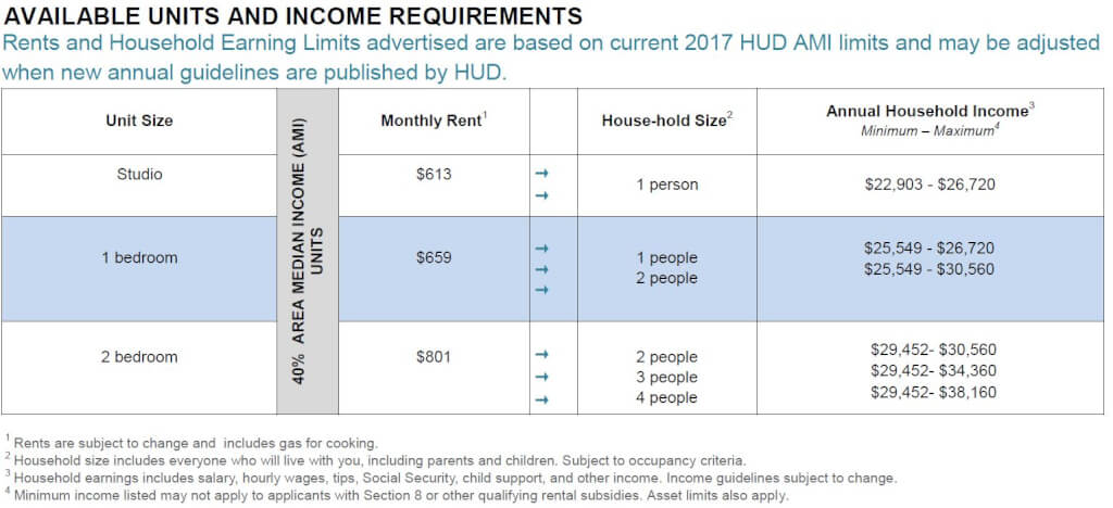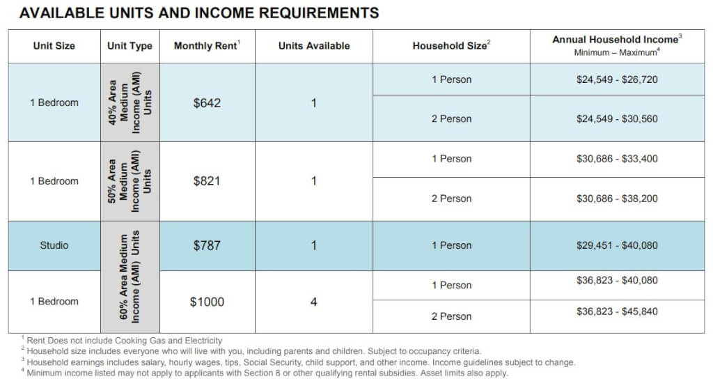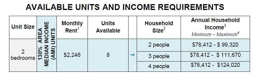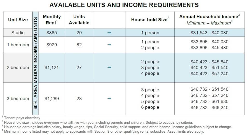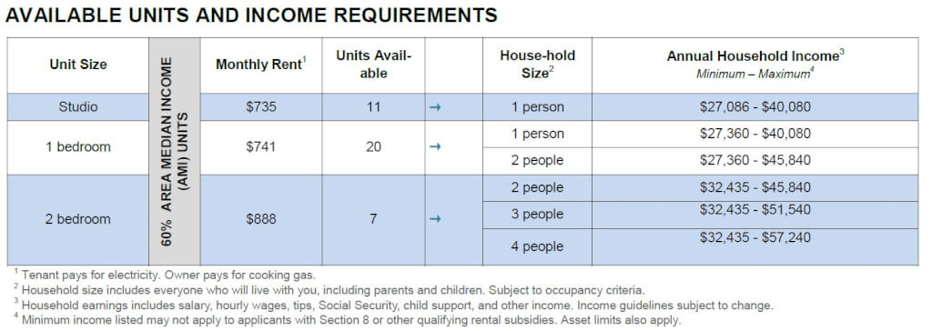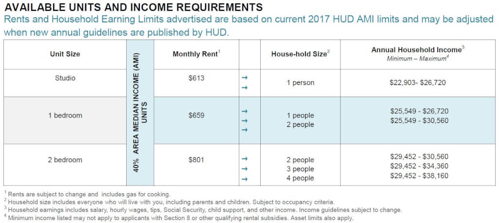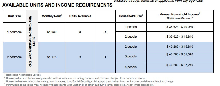 Для участия в лотерее претендент на студию должен зарабатывать от $30 445 до $40 080 в год. Те, кто хочет снимать однокомнатную квартиру за $659 в месяц, должны иметь годовой доход $24 549 — $26 720 (один человек) и $24 549 — $30 560, если в семье два человека. Трехкомнатная квартира за $801 в месяц доступна на следующих условиях: семья из двух человек должна иметь годовой доход в диапазоне $29 451 — $30 560, семья из трех человек — $29 451 — $34 360, семья из четырех человек — $29 451 — $38 160.