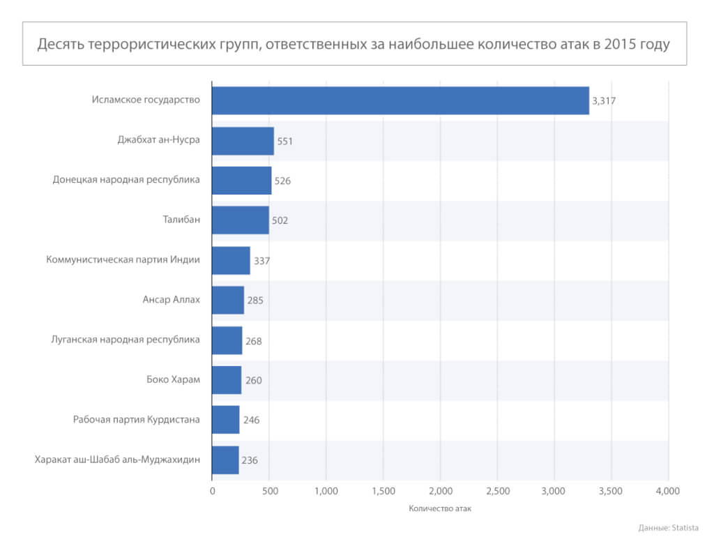 В десятке террористических групп, ответственных за наибольшее количество атак в 2015 году, абсолютное лидерство, по данным портала Statista.com, занимает «Исламское государство».