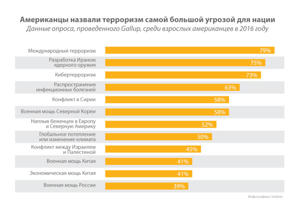 Жители США считают международный терроризм главной угрозой для нации. Таковы данные опроса, проведенного Gallup в начале 2016 года. Сразу 79% американцев выражают опасения в связи с терактами.