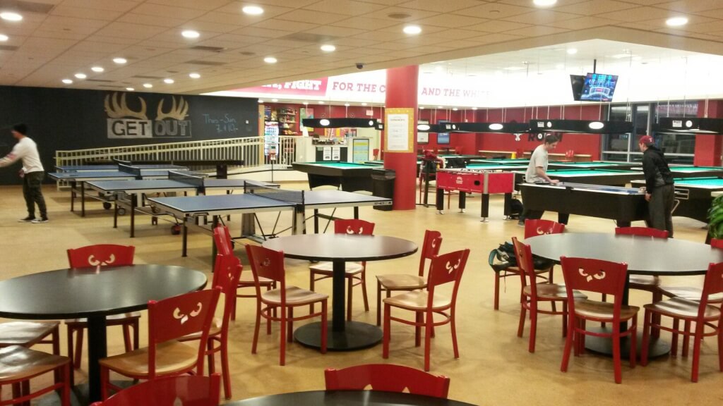 Другое интересное место — это студенческий центр. Насколько я понял, тут все просто тусуются и обедают, классов тут не бывает. Прямо в холле висит огромный экран, на котором транслируются игры. В одном крыле есть комната для развлечений, где можно на халяву поиграть в настольный футбол, пин-понг, аэрохоккей или видеоигры. Тут же находится бесплатный кинотеатр, где иногда показывают фильмы или значимые спортивные события. А вот за бильярд придется заплатить около 3 долларов в час.