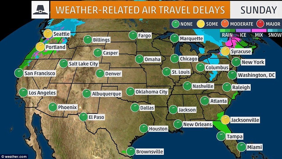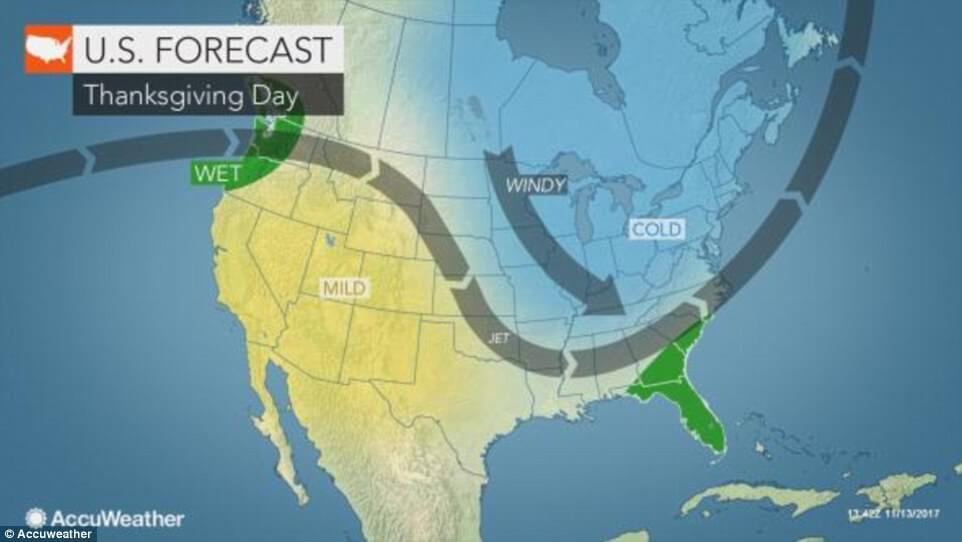 Дождь и снег будет сопровождать американцев, которые отправятся в путешествие на День благодарения, начиная с этих выходных, а также продолжится на следующей неделе, пишет Daily Mail.
