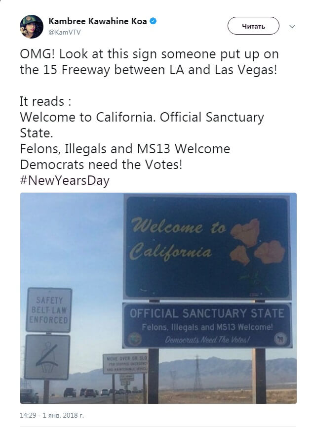 После вступления в силу закона нашлись те, кто решил другим способом показать свое недовольство. Под дорожным знаком «Добро пожаловать в Калифорнию», который видят водители, приезжающие из Аризоны и Невады, неизвестные добавили надпись «Официальный штат-убежище. Уголовники, нелегалы и члены банды MS13, добро пожаловать!».