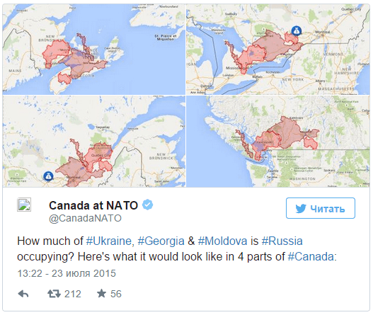 Официальное представительство Канады в НАТО опубликовало твит с наглядной демонстрацией российской агрессии в Грузии, Украине и Молдове.
