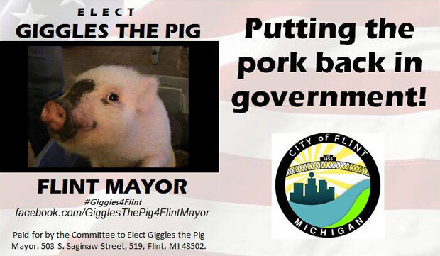 В американском городе Флинт (штат Мичиган) кандидатом на выборах мэра стала свинья по кличке Гигглз. Животное попало в список претендентов на должность благодаря усилиям местного адвоката Майкла Юинга (Michael Ewing).