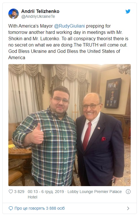 Чуть позже фото с адвокатом Трампа на своей страничке в Twitter опубликовал нардеп Андрей Телиженко, с которым Джулиани уже виделся в Будапеште.