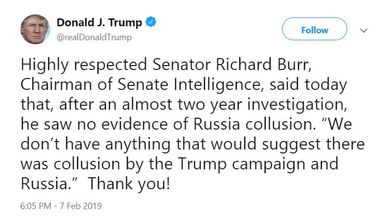По словам Берра, «на основе имеющихся сегодня доказательств» его комитет не может однозначно заявить о сговоре между Трампом и правительством России.